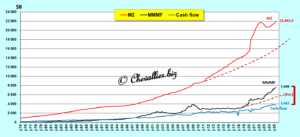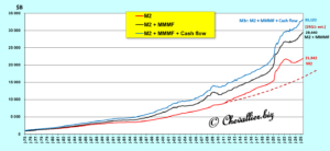 In fact, this total money supply in the United States, which I denote M3r (with an r to indicate that this money supply is revised), i.e. held by Americans, is equal to the sum of the monetary aggregate M2 (the figures for which are still published monthly by the Fed), money market mutual funds (MMMF), and corporate net cash flow (CNCF).