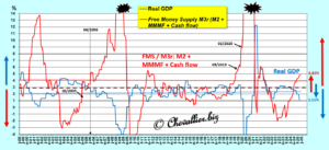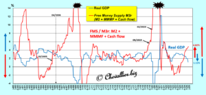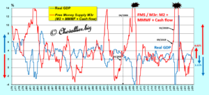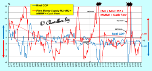 More precisely, it is the change in what I call the free money supply M3r, which is the difference between, on the one hand, the change (year-on-year in percentage terms) in this money supply M3r defined as the sum of the monetary aggregate M2, deposits in money market mutual funds (MMMF) and corporate net cash flow (Corporate net cash flow, CNCF), and, on the other hand, (minus) the variation in real GDP (year-on-year in percentage terms), which causes an inverse reaction in real GDP.