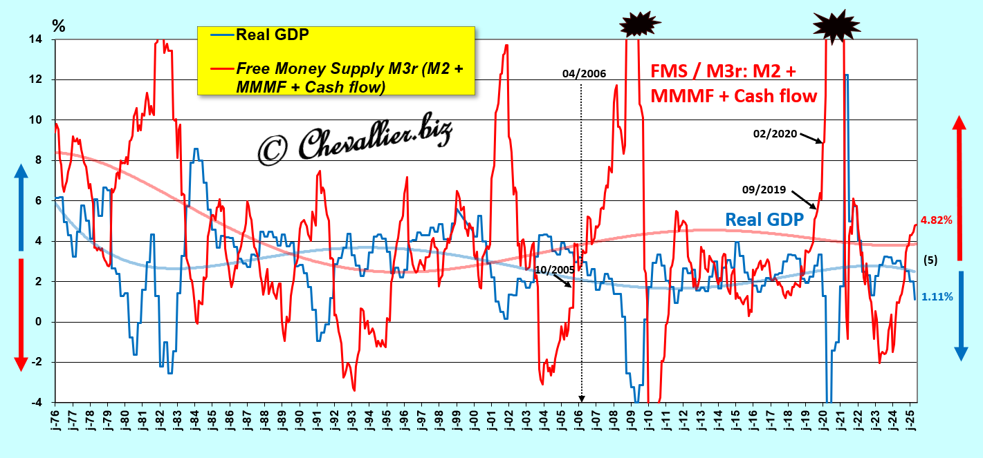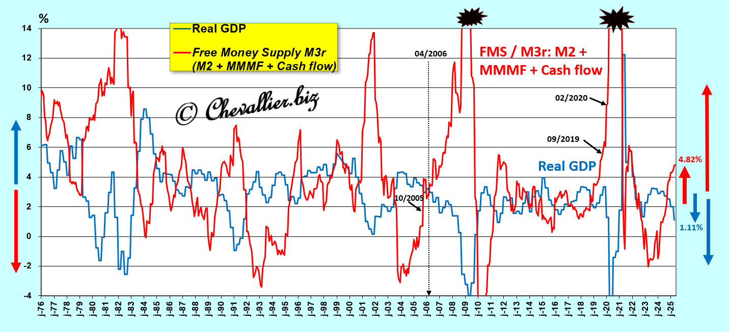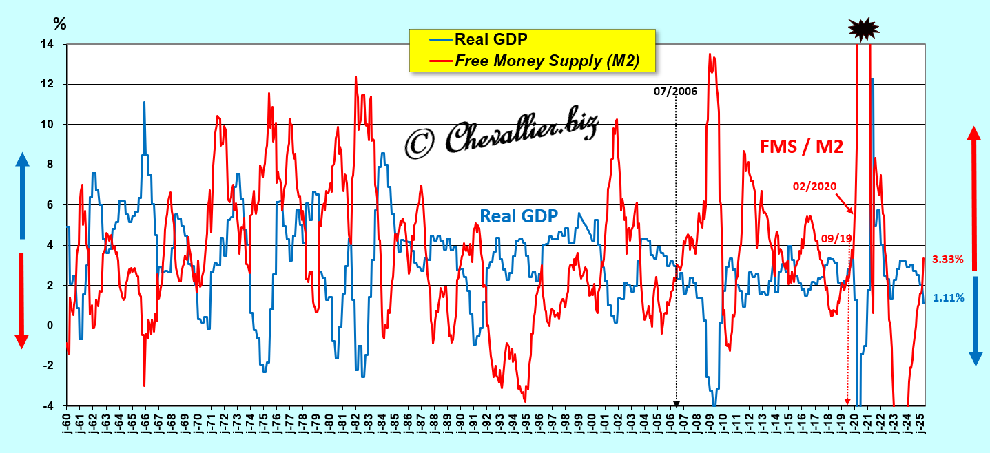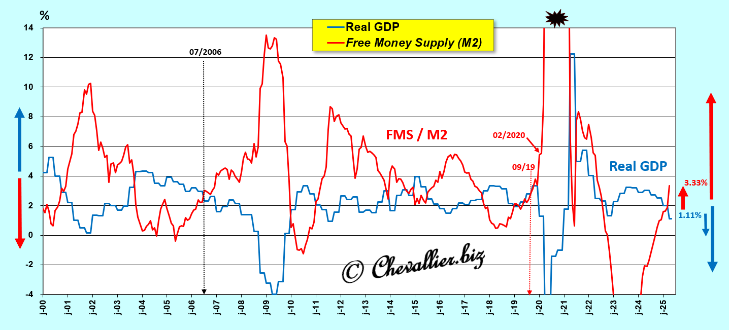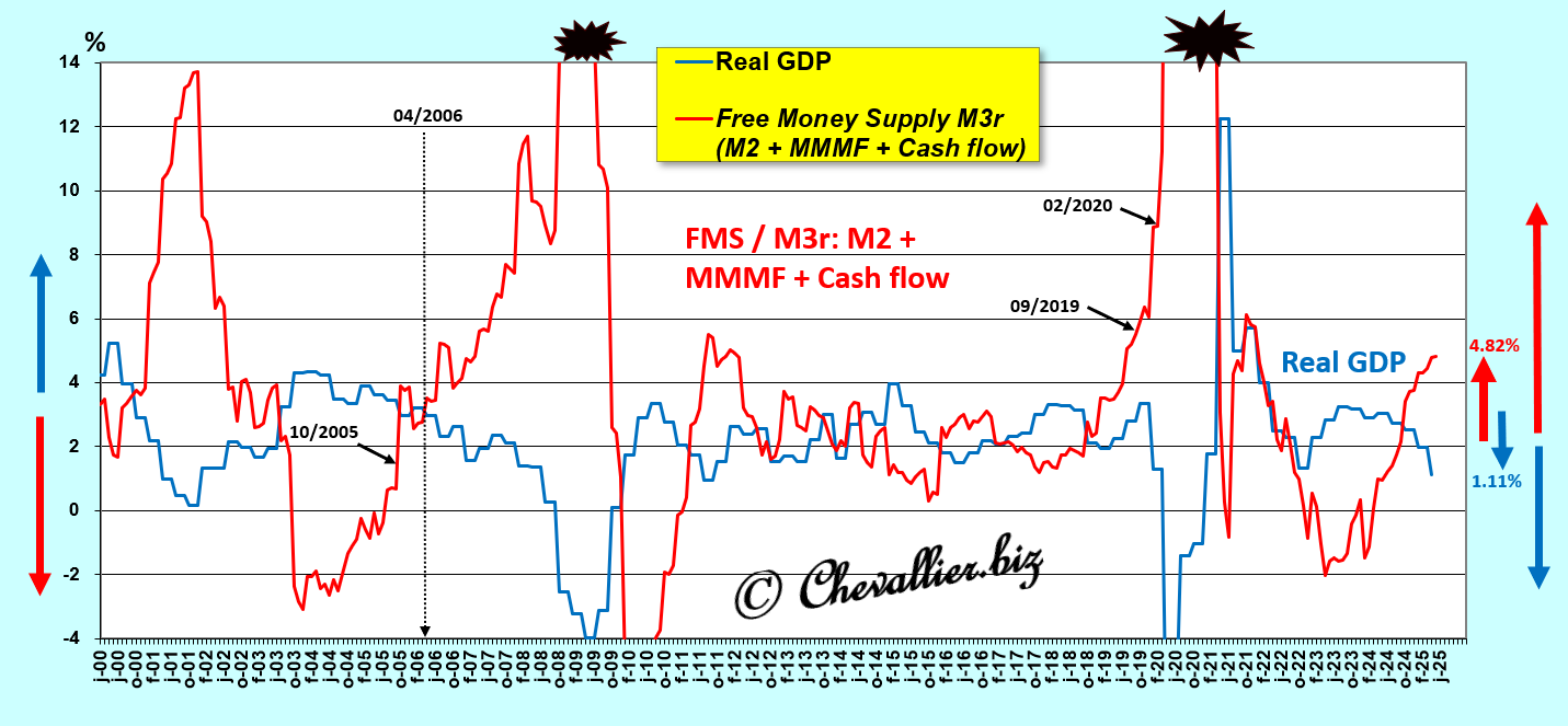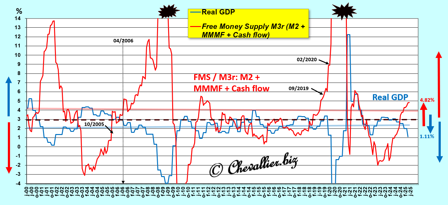 A close-up of the period beginning in January 2000 clearly highlights this law of free money supply M3r and, above all, shows that this free money supply M3r continues to increase (by 4.62% year-on-year), which means that real GDP growth (+1.1% year-on-year) is also continuing to decline and will plunge into negative territory in the very near future… which has already happened in the first quarter of 2025 compared to the previous quarter!