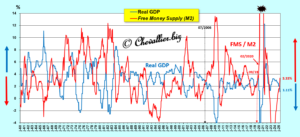 To simplify, an increase in this M3r money supply held by Americans leads to a decline in real GDP, and vice versa, which has been true over the long term, since these data have been published by our friend Fred in St. Louis.