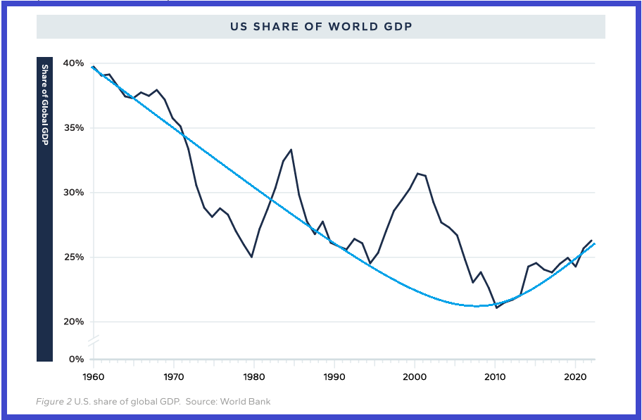 [The share of US GDP in relation to the GDP of the rest of the world fell from 1960 to 2010 and has risen slightly since then.]