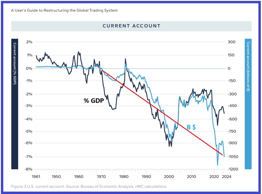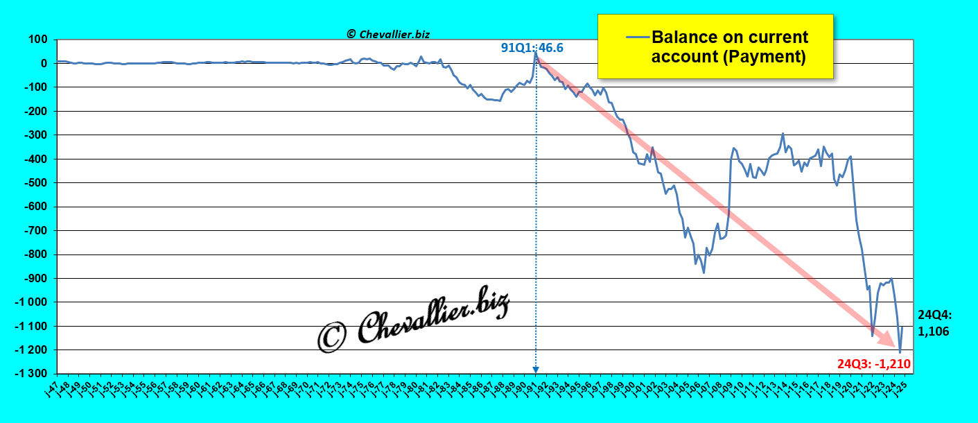 Indeed, the balance of current accounts (taken from the balance of payments) of the United States began to become in deficit after the first quarter of 1991, plunging deeply from 2020 to reach a low of… 1,210 billion dollars at the end of the third quarter of 2024!
