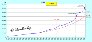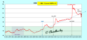 Consequently, a major crisis is brewing, in line with Arthur Laffer’s adage: the first pillar of Reaganomics (and monetarism) is sound money, which means that a nation must always maintain an M3/GDP ratio below 80%, which is not currently the case!