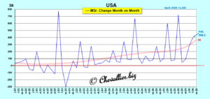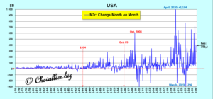 The month-over-month variations in this M3r money supply over the long term confirm that these financial turbulences began to manifest in the late 1990s and became extraordinary starting in the fall of 2005, the date on which Ben Bernanke was chosen to lead the Fed because he was renowned as an expert in crisis management for having brilliantly studied the 1929 crisis.