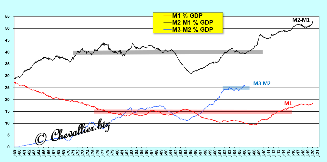 The long-term trend of this M3r/GDP (as a percentage) since these data have been published by our friend Fred of St. Louis, highlights that money remained sound in the United States during the second half of the 20th century, but that a monetary expansion ultimately fatal to the economy developed there, particularly starting in July 2007, exploding in 2020 with this coronavirus crisis, with the situation deteriorating further recently…