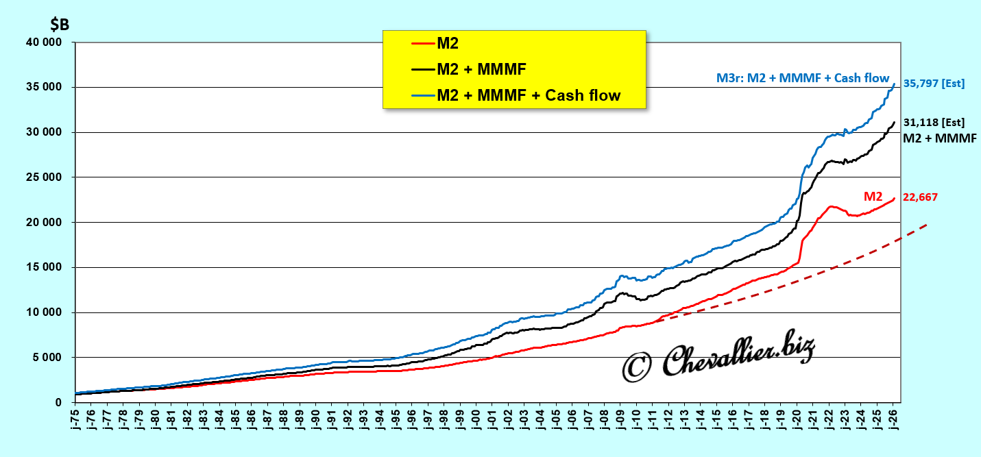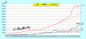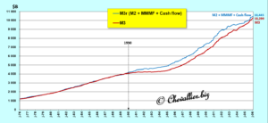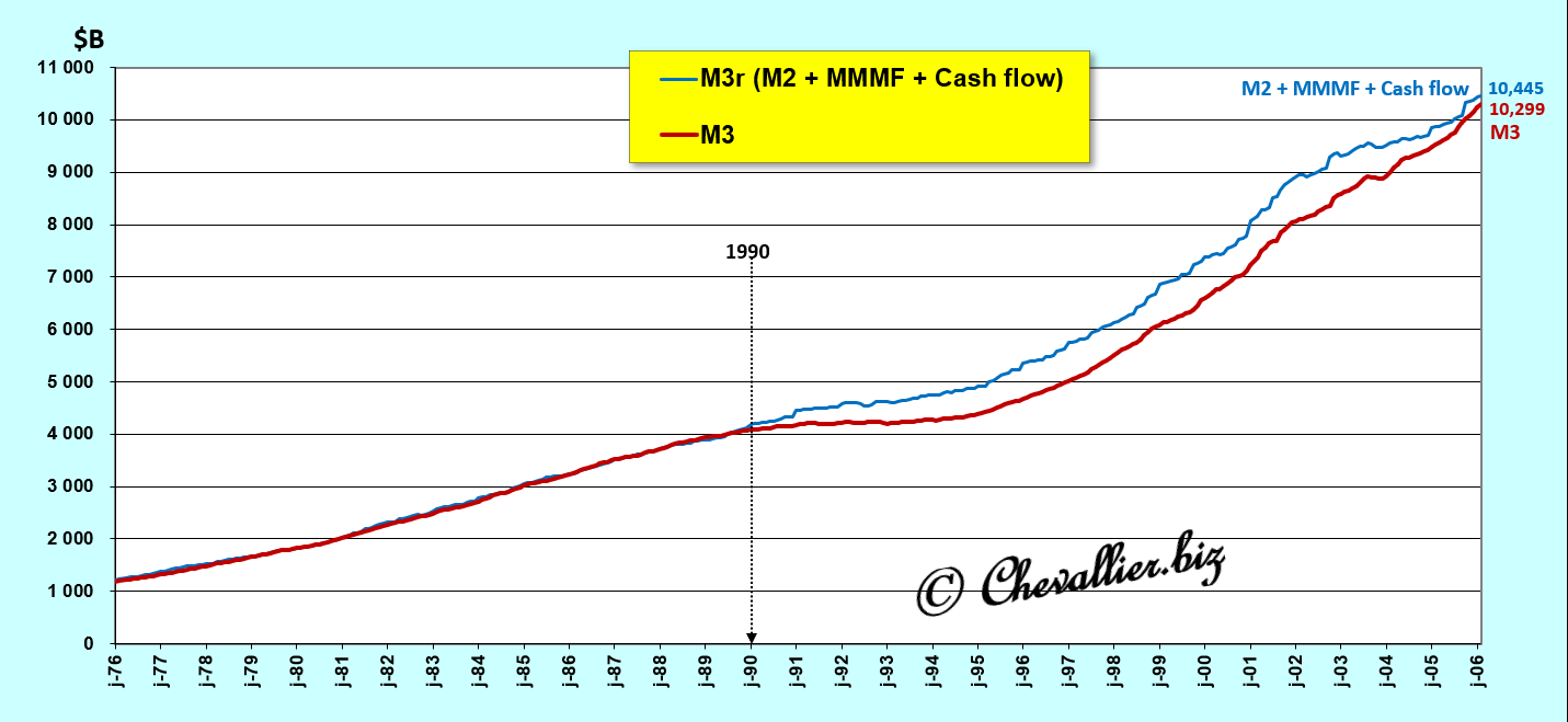 Indeed, a nation’s total money supply M3 consists, on the one hand, of the monetary aggregate M2 (whose figures are still published monthly in the United States) and, on the other hand, of money market mutual funds (MMMF) and corporate net cash flow.