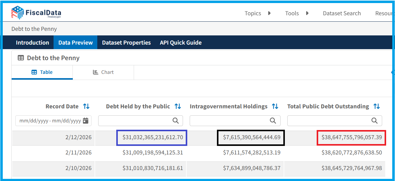 Furthermore, the federal government’s officially published debt amounts to $38,647 billion, but $7,615 billion is abnormally held in the treasuries of intra-governmental entities and also invested largely in government securities.
